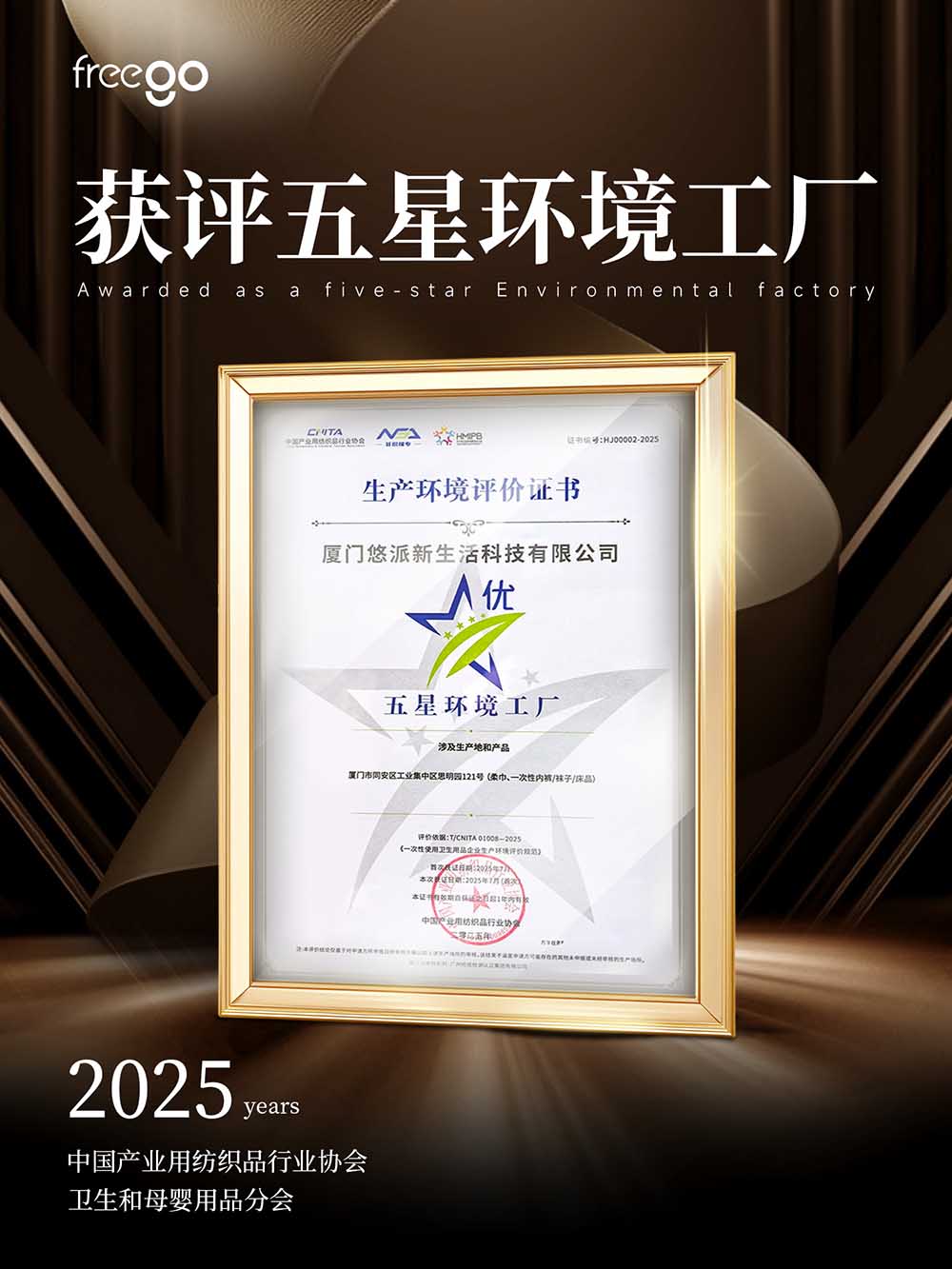 7月17日,在中國產(chǎn)業(yè)用紡織品行業(yè)協(xié)會衛(wèi)生和母嬰用品分會第二屆三次理事擴大會議暨第七屆行業(yè)發(fā)展論壇上,T/CINTA 01008-2025《一次性衛(wèi)生用品企業(yè)生產(chǎn)環(huán)境評價規(guī)范》首批貫標企業(yè)名單正式發(fā)布,廈門悠派新生活科技有限公司獲評“五星環(huán)境工廠”。這不僅是一次榮譽加冕,更是工廠硬實力的有力證明。